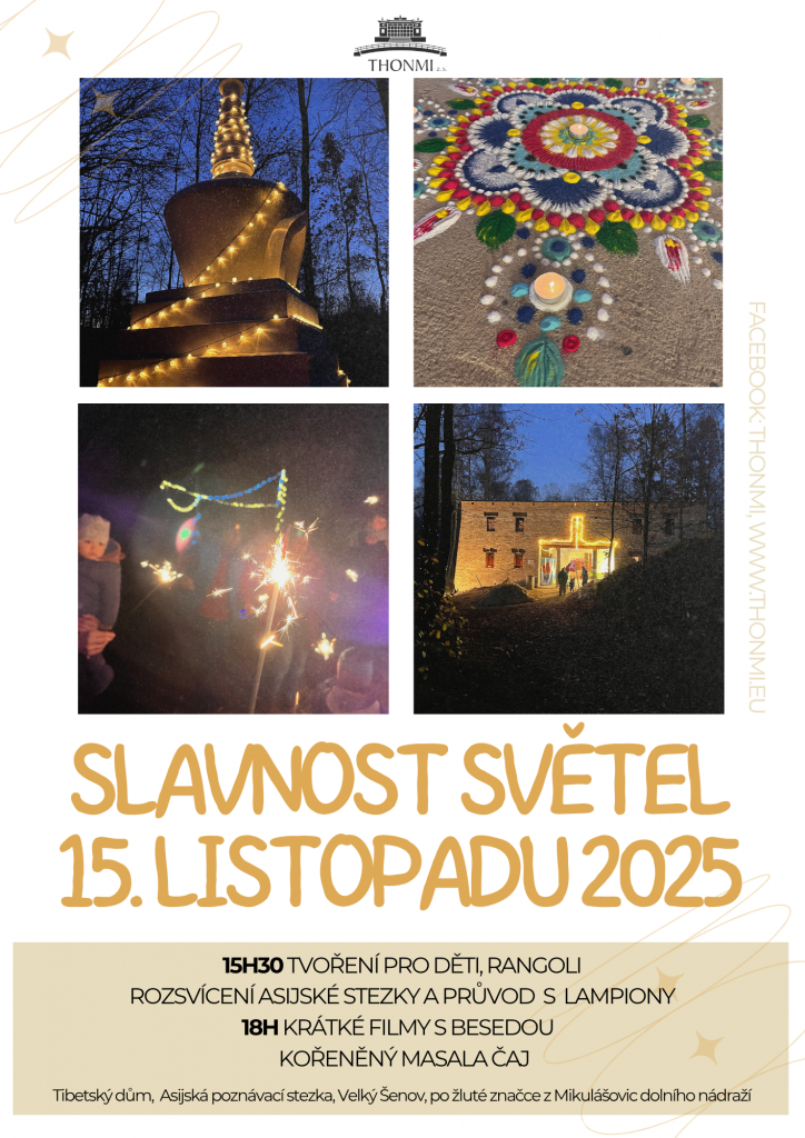 Rodiny s dětmi se od 15:30 mohou těšit na tvořivé dílny a kouzelnou procházku s lampiony osvětlenou stezkou. Nenechte si ujít vznik nádherného vzoru rangoli inspirovaného indickým svátkem světel – Díválí. Na zahřátí si můžete vychutnat šálek kořeněného masala čaje.